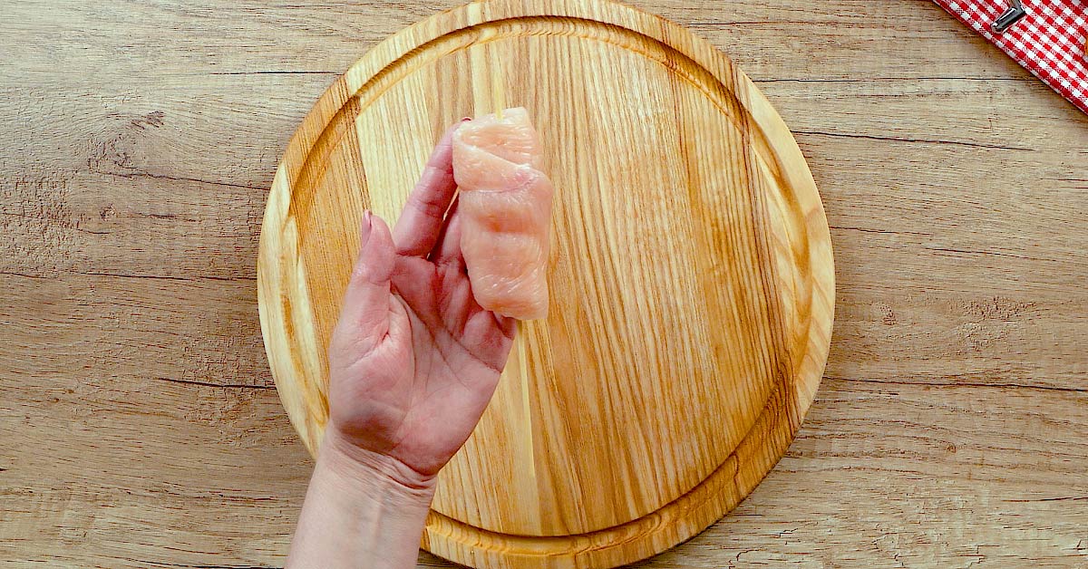 Ser pokrój w grubsze paski. Mąkę, sól i przyprawy wymieszaj w oddzielnej misce. Pokrój piersi wzdłuż na kilka cienkich plasterków.