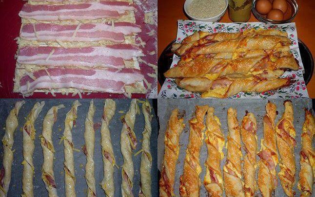 Rozłóż ciasto francuskie na lekko posypanej mąką powierzchni roboczej i lekko je rozwałkuj wałkiem do ciasta. Całą powierzchnię ciasta posyp obficie startym serem i rozłóż na nim plasterki boczku lub suszonej szynki. Ciasto pokroić wzdłuż na paski o szerokości około dwóch centymetrów za pomocą wałka do ciasta, noża do pizzy lub po prostu ostrego noża i ostrożnie zwinąć je w spiralę. Jeśli chcesz, możesz pokroić paski na mniejsze kawałki. Można zrobić paluszki lub mniejsze krakersy.