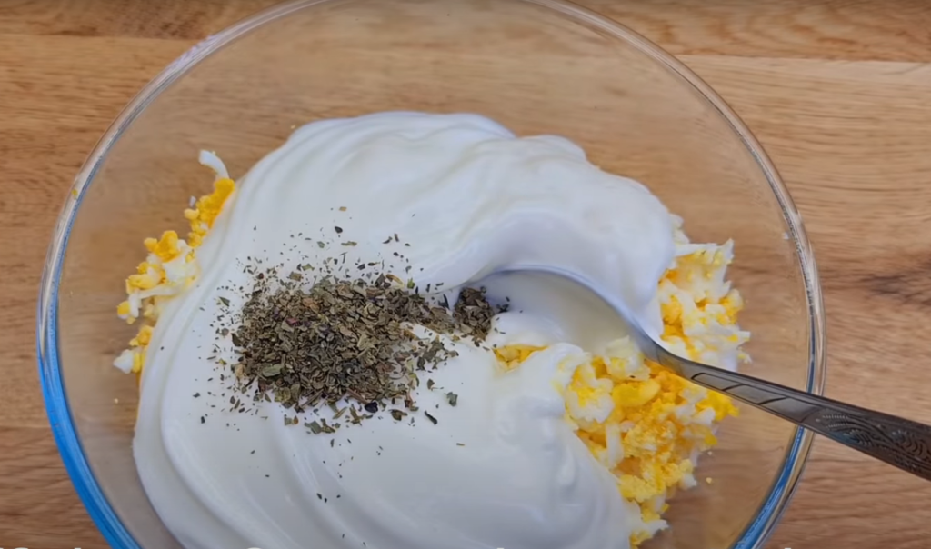 Żółty ser, jajka zetrzyj na tarce o grubych oczkach. Dodaj do tego jogurt naturalny, szczyptę soli i bazylię. Wszystko dokładnie wymieszaj. Tę mieszankę układamy na mięsie.