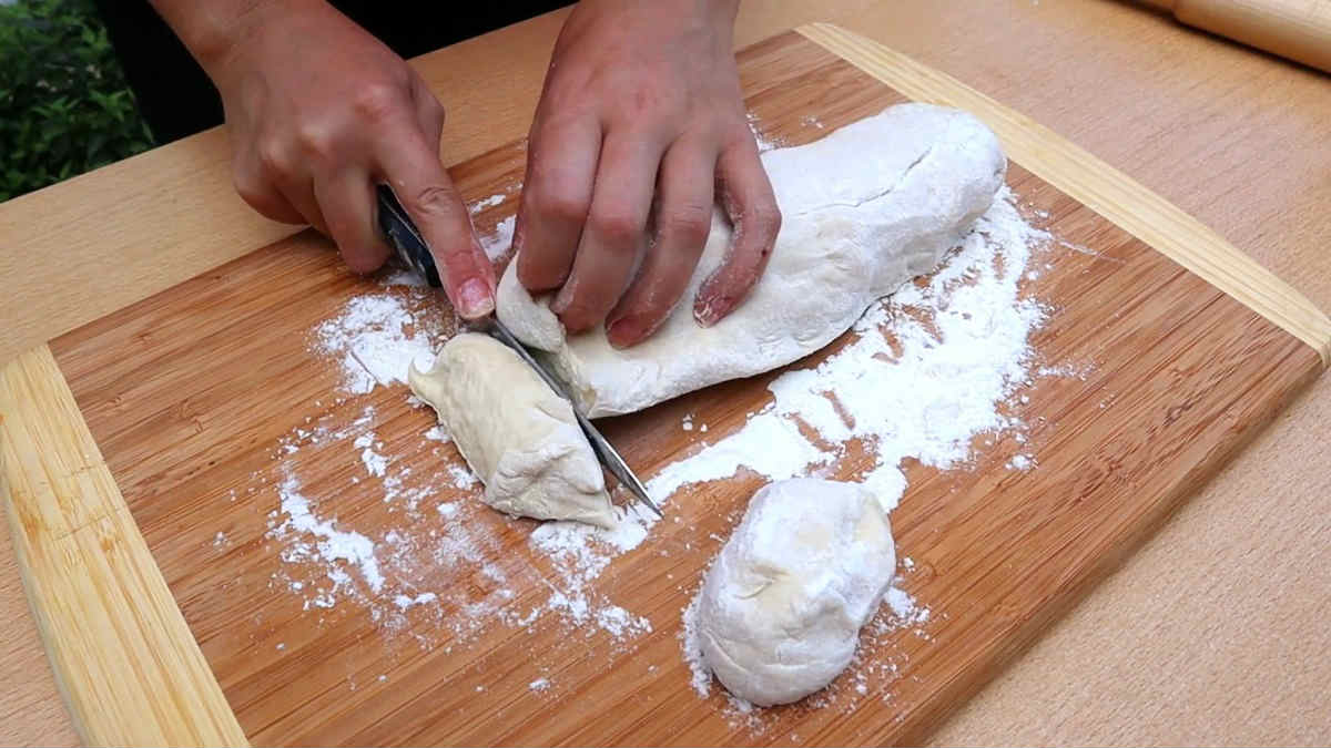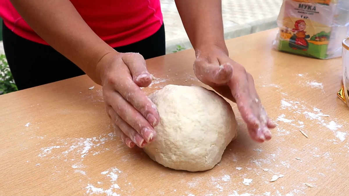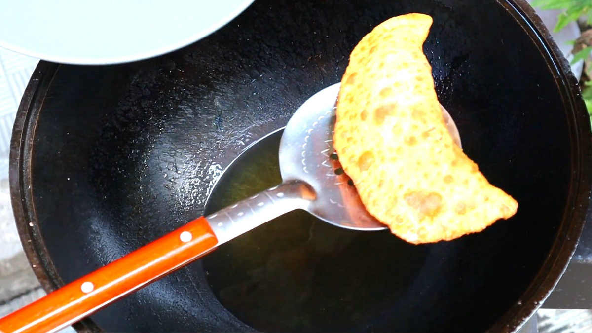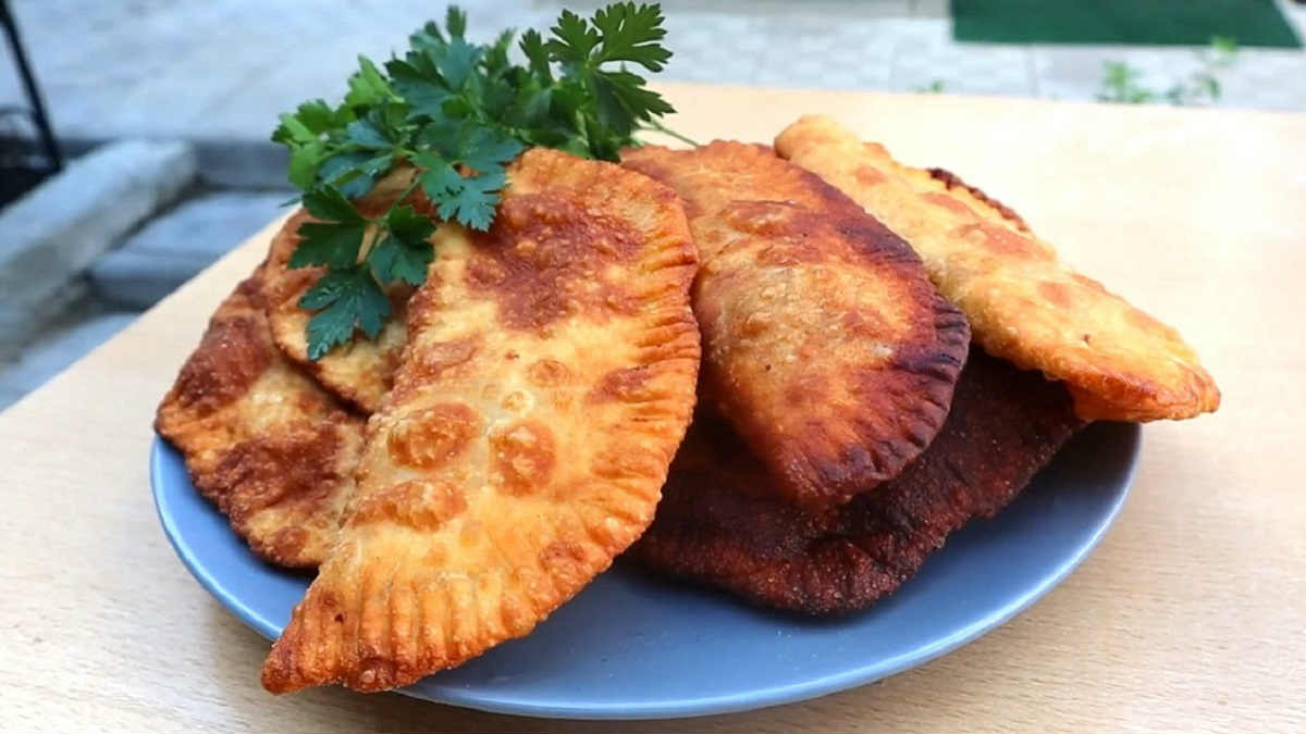 Przykryj je ściereczką lub zawiń w folię i odstaw na 20 minut. W tym czasie przygotuj nadzienie: do mięsa mielonego dodaj grubo posiekaną cebulę, wodę, sól i pieprz. Ciasto podziel na 12 części, każdą z nich uformuj w kulkę. Każdy kawałek ciasta rozwałkuj na płaski placek, na jedną połowę wyłóż łyżkę mięsa mielonego, połącz brzegi. Użyj wałka do ciasta, aby docisnąć porządnie krawędzie, aby sok nie wyciekał podczas smażenia. Rozgrzej olej roślinny na patelni. Smaż przekąski z obu stron na złoty kolor.