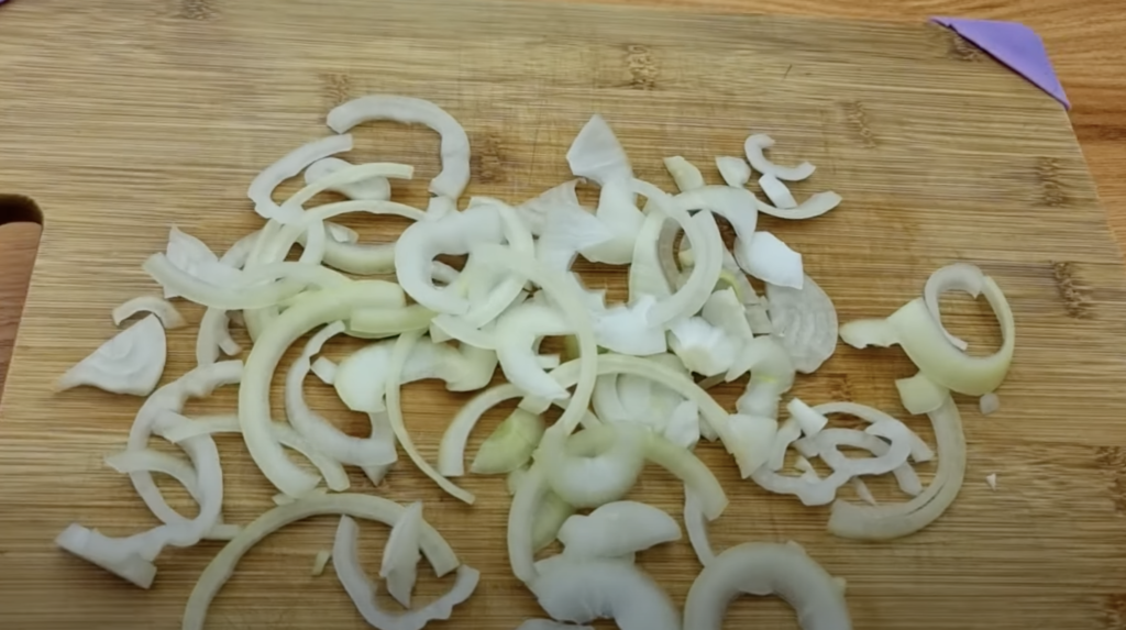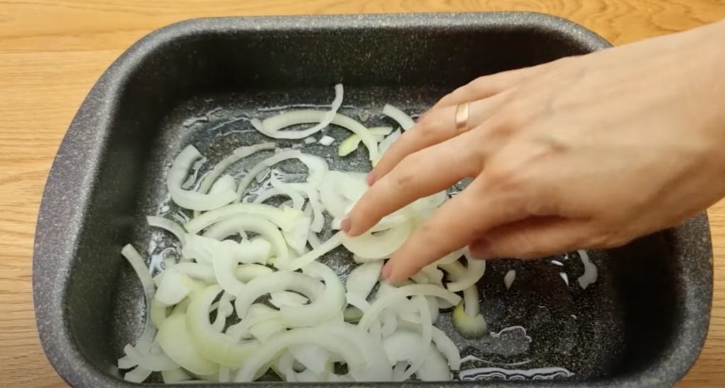 Obierz i pokrój ziemniaki. Dopraw je solą, pieprzem i odrobiną oleju. Ułóż na cebuli.