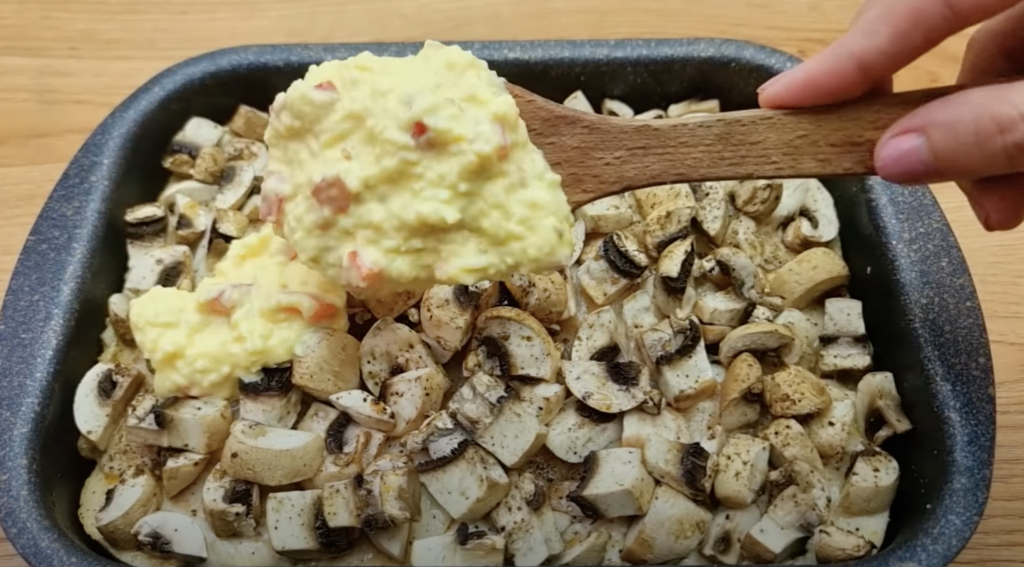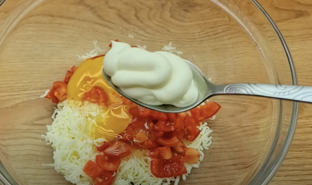 Wymieszaj wszystkie składniki sosu – starty ser, 2 pokrojone pomidory, jajka, majonez. Nałóż go na wierzch dana. Następnie piecz w temperaturze 180 stopni przez kolejne 10 minut.