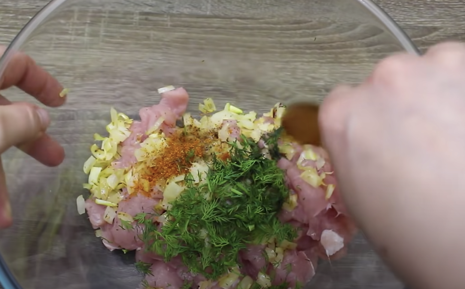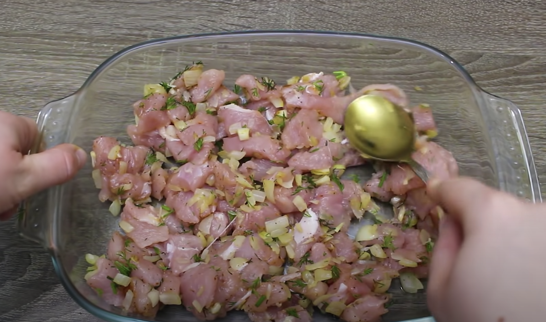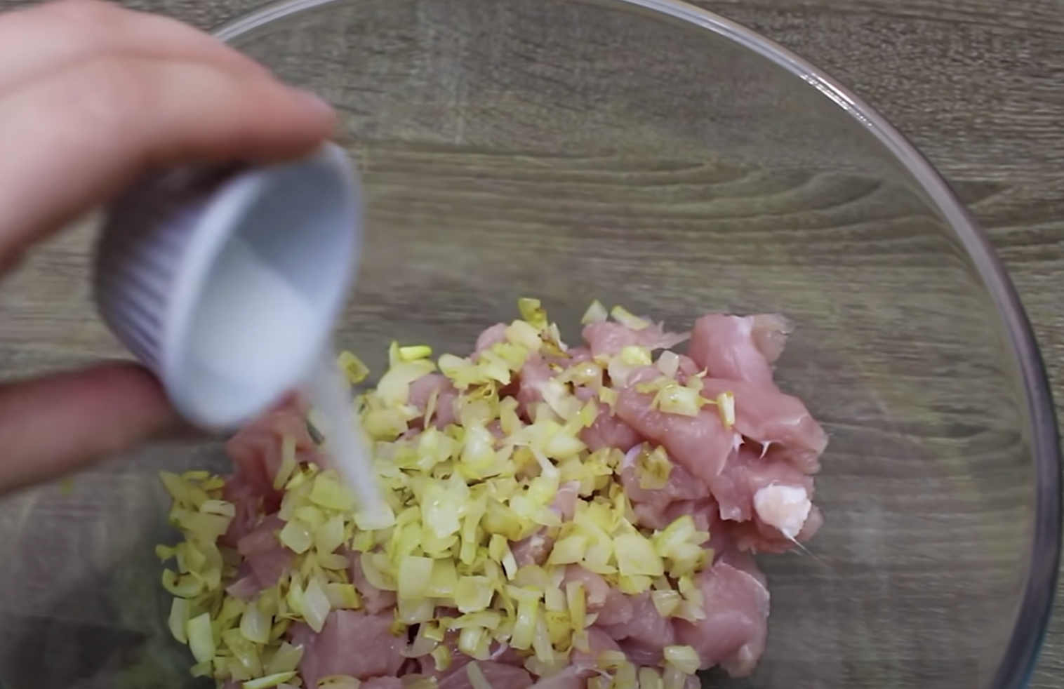 Do miski włóż kawałki kurczaka, cebulę, sól i wszystkie pozostałe przyprawy.
