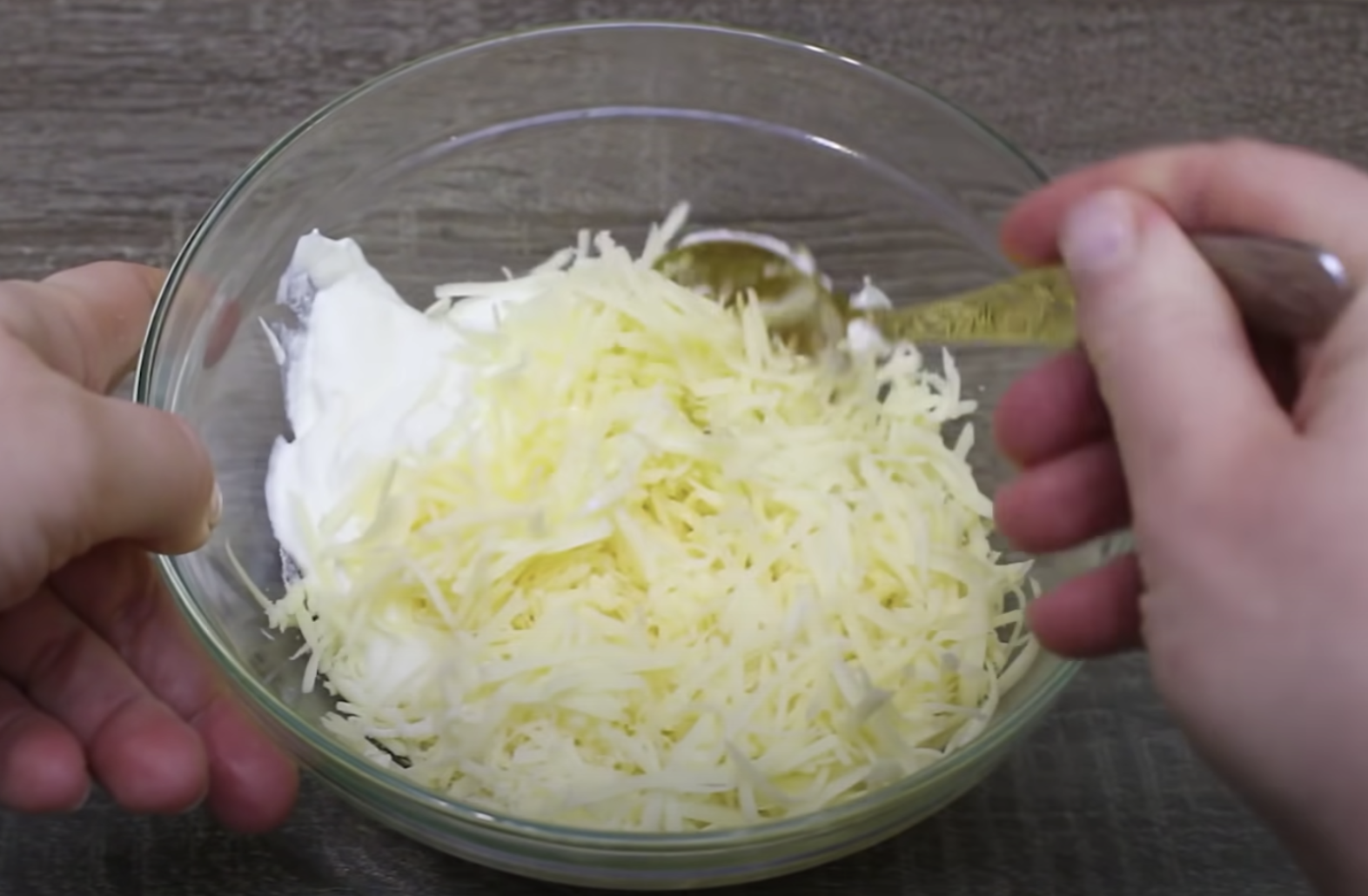 Wymieszaj wszystkie składniki sosu w misce – zetrzyj ser na tarce i wymieszaj z masą.
