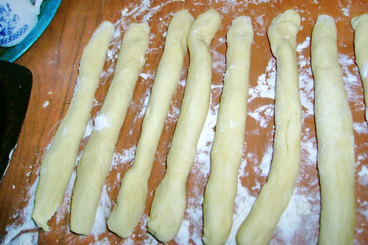 Ciasto cienko rozwałkuj, pokrój na 6-8 kawałków. Umieść wiśnie w każdym rzędzie i zwiń.