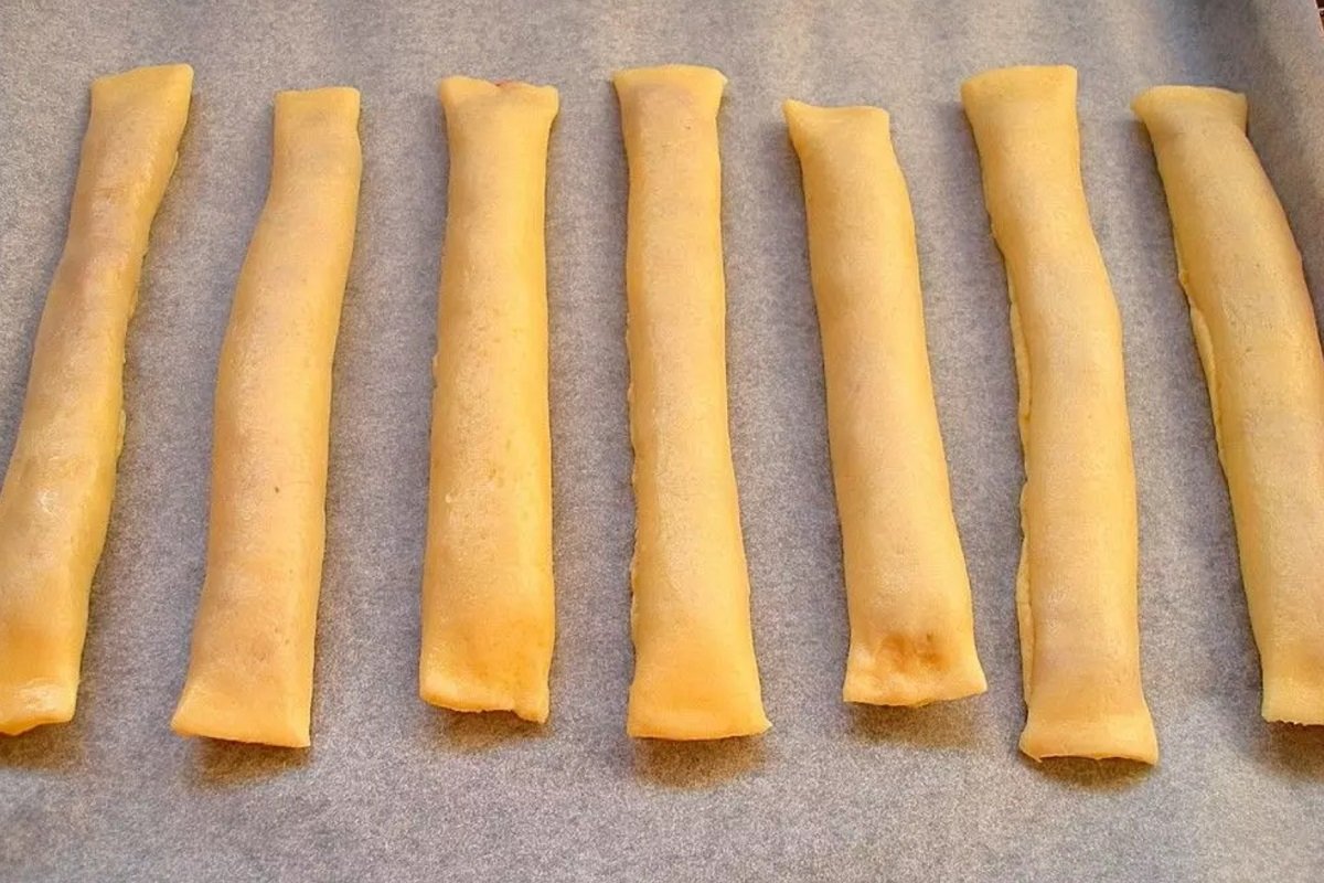 Nasmaruj blachę do pieczenia olejem, ułóż rurki i piecz w piekarniku nagrzanym do 200 stopni przez 20 minut.