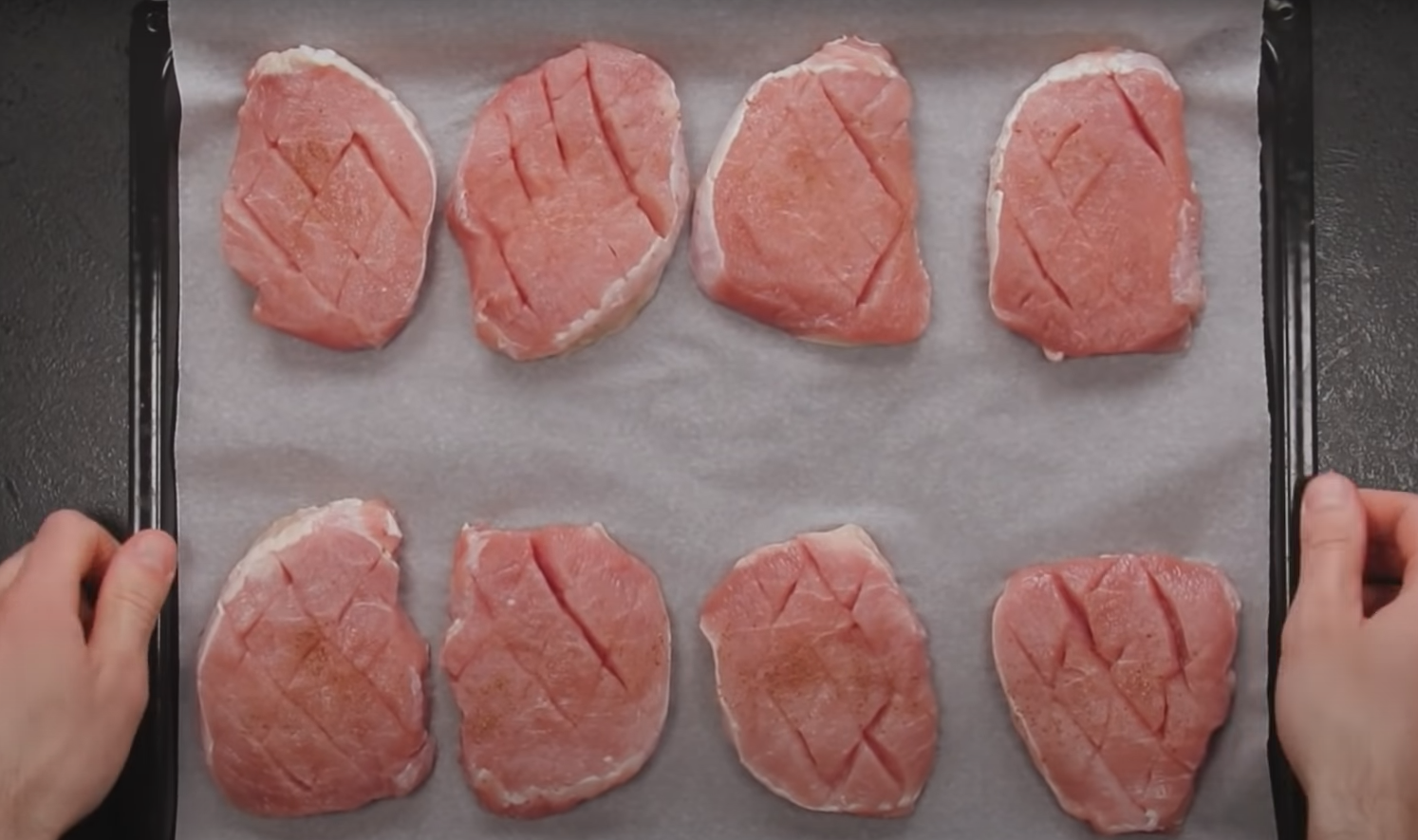 Ostrym nożem natnij mięso tworząc na nim kratkę z obu stron. Dopraw do smaku i przełóż na blachę wyłożoną papierem do pieczenia.