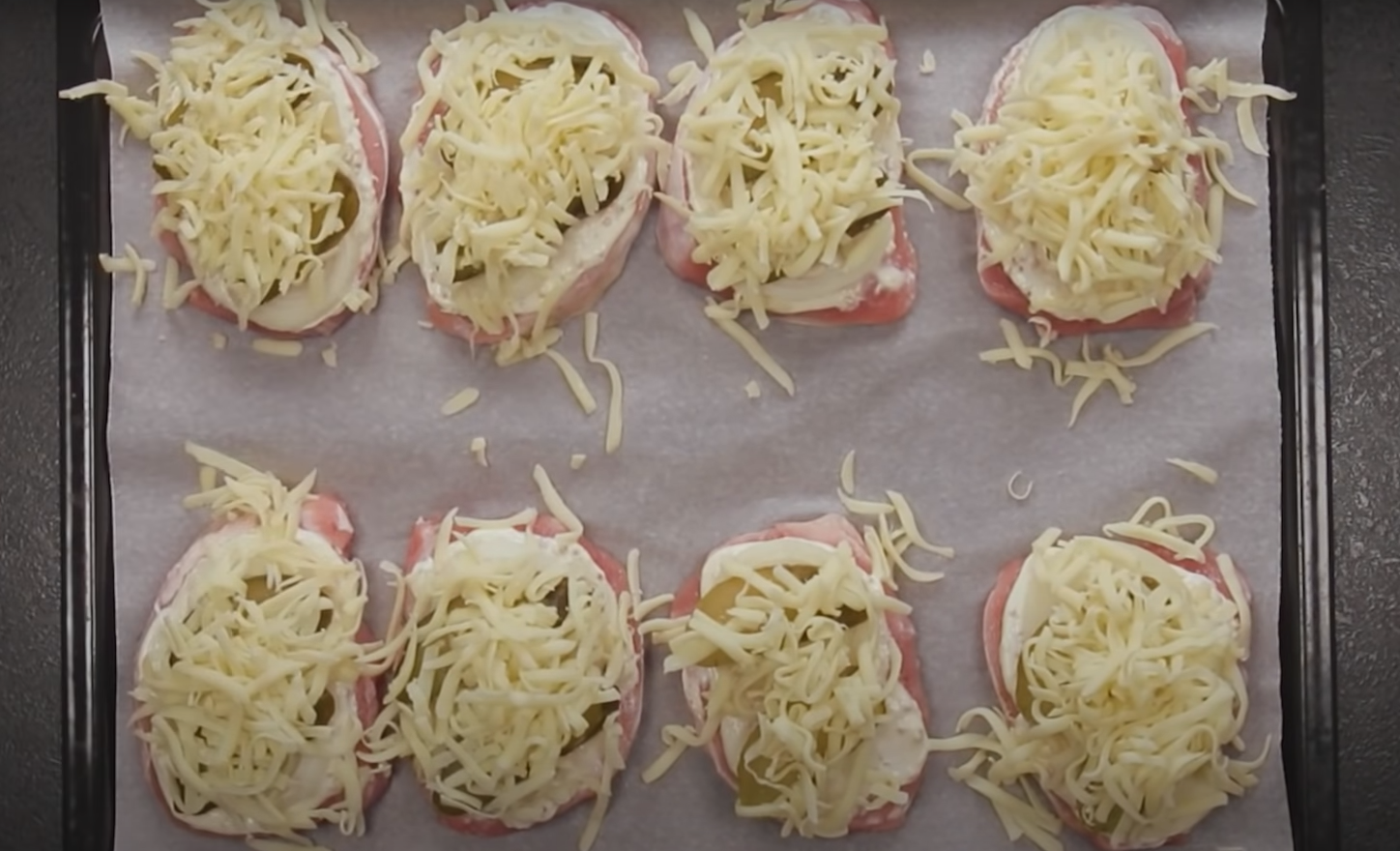 Pokrój ogórki i cebulę w krążki, ułóż na mięsie i posyp startym serem. Piecz w piekarniku nagrzanym do 180°C przez około 40 minut.