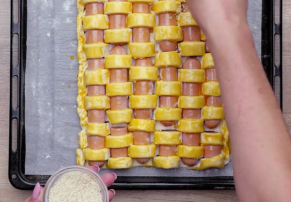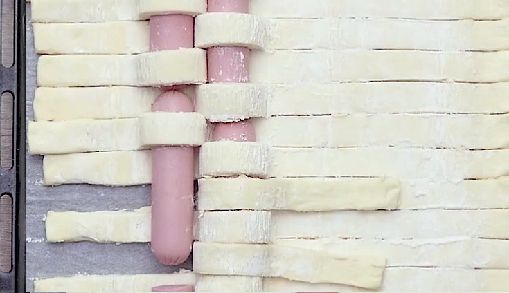 Rozpocznij wplatanie parówek od środka ciasta, kierując się w stronę brzegów. Co drugi pasek złóż na pół, środkowy rząd parówek ułóż prostopadle do pasków ciasta i przykryj złożonymi paskami.