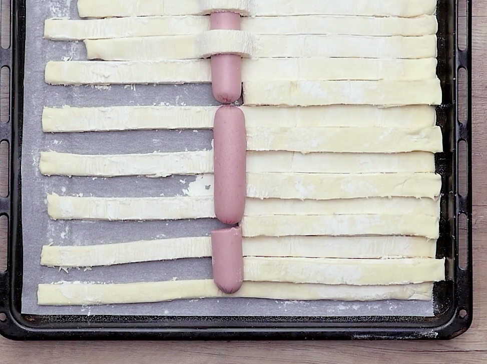Następnie zawiń paski ciasta zaczynając od pierwszego, ponownie ułóż rząd parówek i przykryj złożonymi kawałkami ciasta. Zrób to samo z pozostałymi.