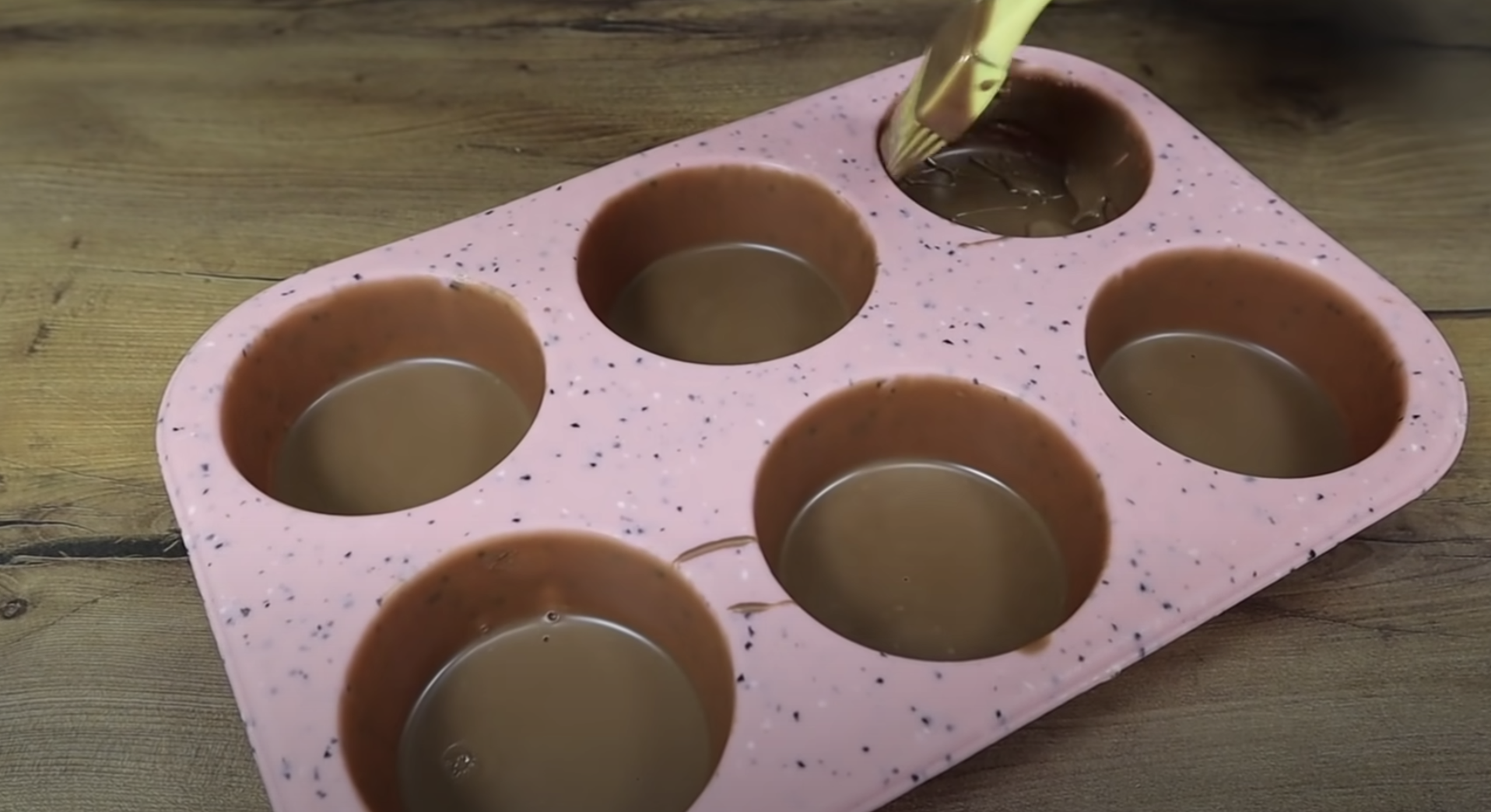 W międzyczasie przygotuj formę do muffinek – najlepiej sprawdzi się silikonowa. W poszczególnych wgłębieniach rozprowadź za pomocą pędzla kuchennego masę czekoladową. Wstaw całość do zamrażarki na około 10 minut.