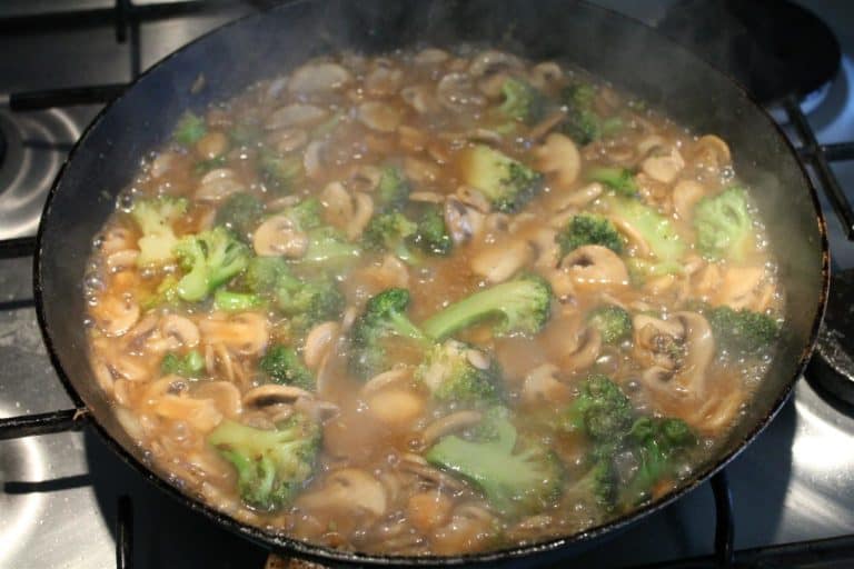 Na patelnię dodać drobno pokrojoną cebulę, brokuły i pieczarki. Zalej marynatą i gotuj, aż warzywa będą miękkie.