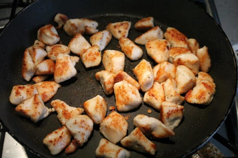 Na koniec dodać mięso na patelnię i krótko wszystko razem smażyć.