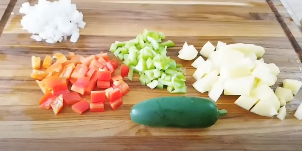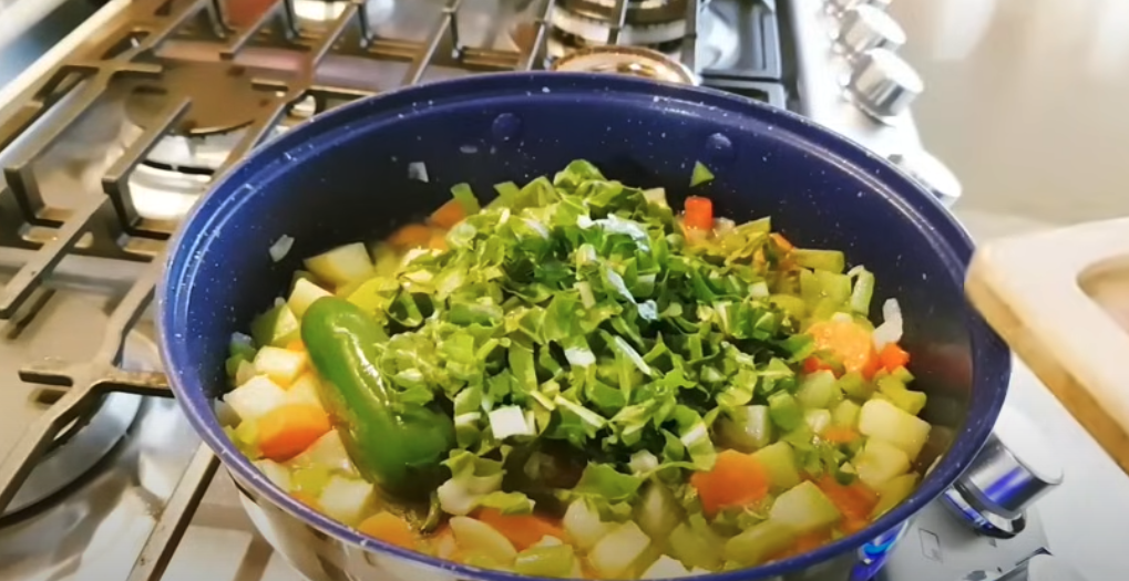 Umyj i pokrój wszystkie warzywa zgodnie z opisem powyżej. Rozgrzej oliwę z oliwek na dużej patelni na średnim ogniu. Dodaj posiekaną cebulę i smaż przez 2-3 minuty, aż stanie się przezroczysta. Dodaj pokrojone marchewki i ziemniaki, smaż przez kolejne 5 minut, mieszając od czasu do czasu. Dodaj pokrojone zieloną i czerwoną paprykę oraz boćwinę do patelni. Mieszaj i smaż przez 3-4 minuty, aż warzywa lekko zmiękną.