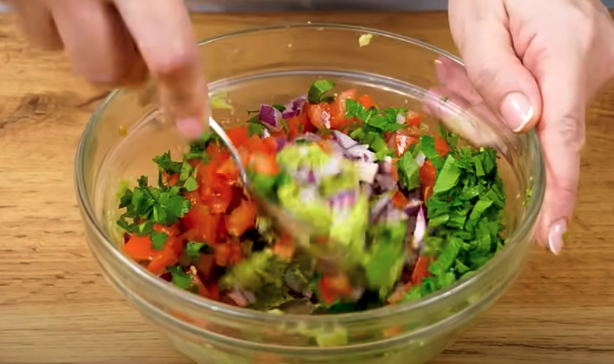 Pokrój czerwoną cebulę na drobne kawałki. Obierz i posiekaj czosnek. Pokrój pomidory na małe kawałki. Posiekaj kolendrę (lub pietruszkę). Dodaj posiekaną czerwoną cebulę, czosnek, pomidory i kolendrę do miski z awokado. Skrop sokiem z cytryny, dopraw solą i czarnym pieprzem do smaku. Wszystko dobrze wymieszaj, aby składniki się połączyły. Nałóż mieszankę awokado na chrupiące plasterki bagietki. Serwuj przystawkę na talerzu i podawaj od razu.
