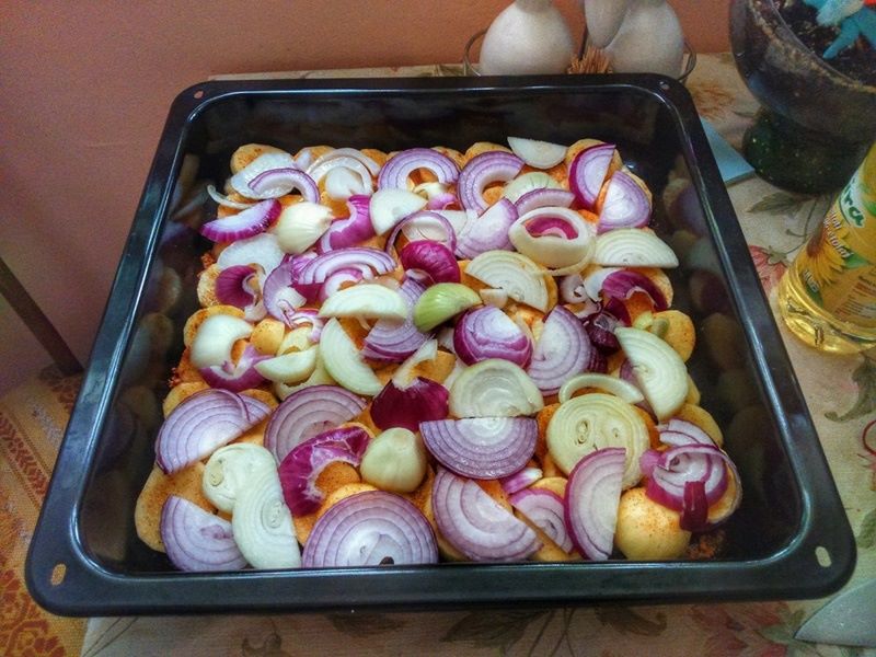 Cebulę czerwoną i białą pokrój na plasterki, a boczek w kostkę i rozłóż na ziemniakach.