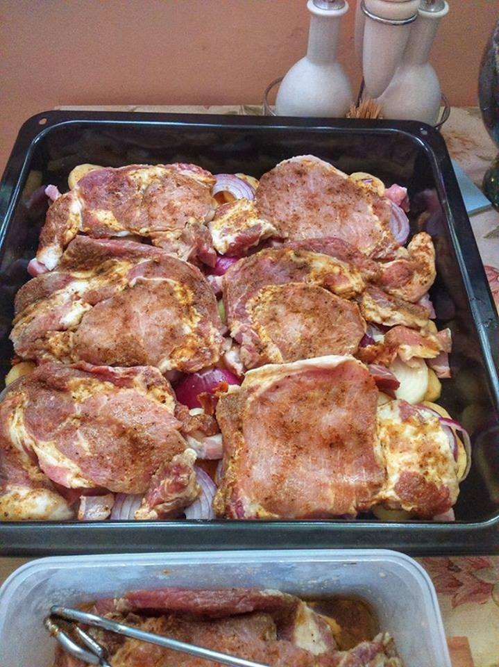 Zamarynuj karkówkę używając wcześniej zrobionej marynaty i połóż ją na ziemniakach, cebuli i boczku.