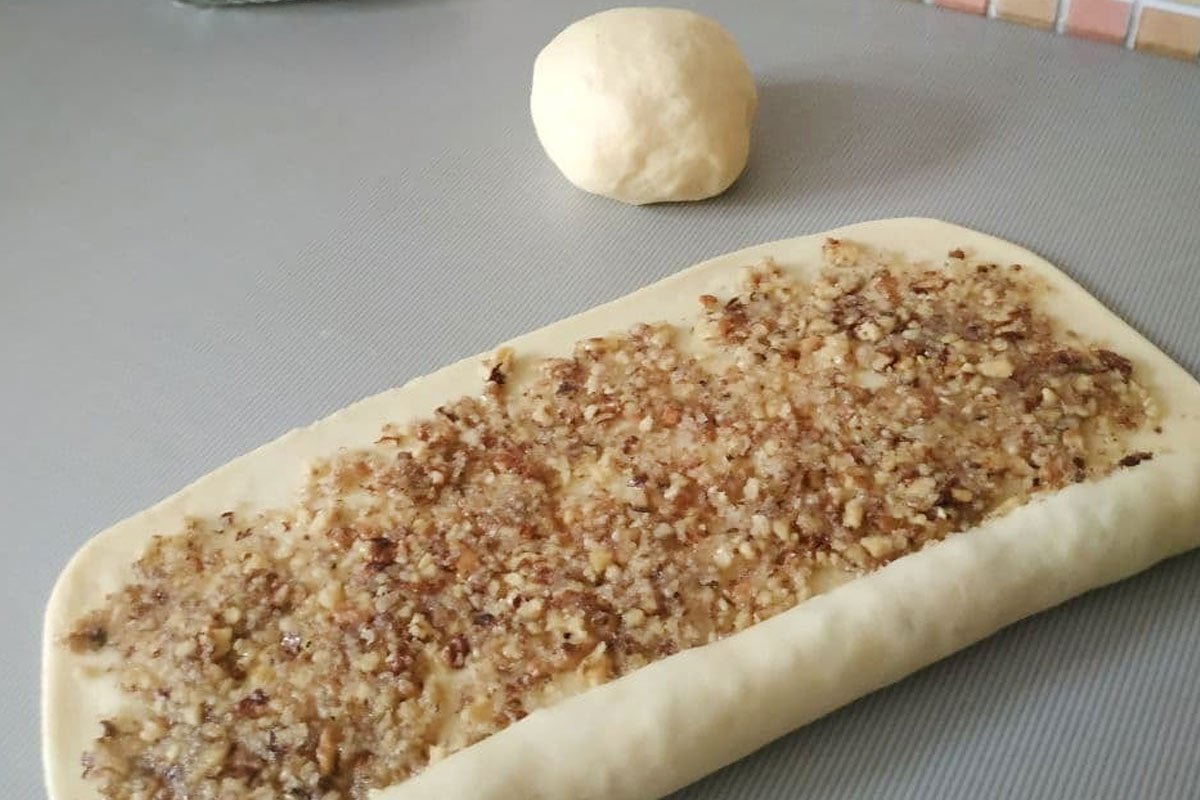 Do nadzienia musimy zrobić 2 rzeczy jednocześnie. Smaż i posiekaj orzechy i podsmaż trochę mąkę na innej patelni, aż stanie się beżowa. Smak będzie doskonały. Mąkę wymieszać z masłem, cukrem i orzechami włoskimi. Nadzienie wykładamy na ciasto i zawijamy w bułki. Teraz pozostaje posmarować bułki jajkiem, trochę szturchnąć widelcem i, jeśli chcesz, pokroić na porcje.