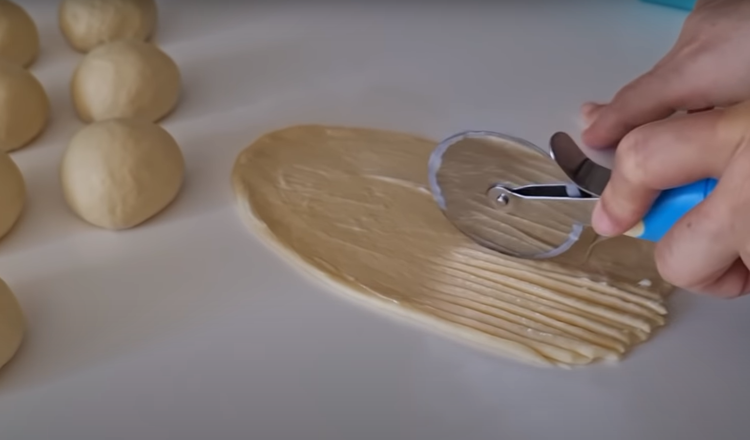 Najpierw delikatnie spłaszcz każdy kawałek dłońmi, a następnie rozwałkuj na owal i posmaruj cienką warstwą miękkiego masła i twarogu. Teraz pokrój ciasto do połowy w cienkie paski.