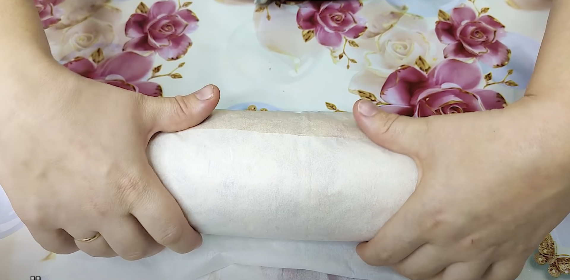 Po wyjęciu z piekarnika odwróć ciasto (możesz pomóc sobie papierem czy deską do krojenia) i delikatnie zdejmij pergamin. Zwiń ostrożnie w roladę i pozostaw do ostygnięcia.