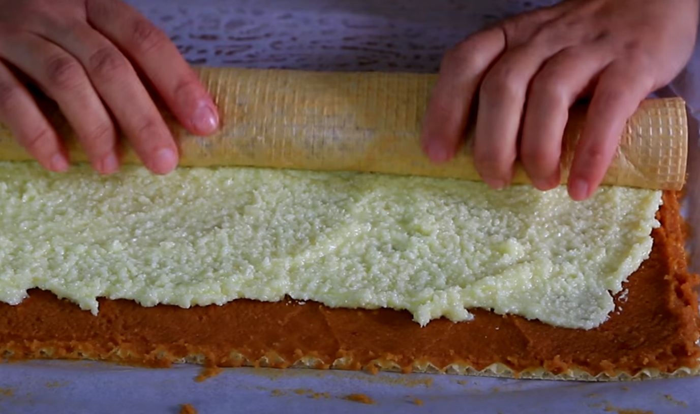 Czas na egzotyczny składnik! W innym garnku połącz cukier, wodę i masło. Jak zacznie to wyglądać jak karmel – dodaj mleko i wiórki kokosowe. Gdy masz już mieszankę marzeń – połącz ją z pierwszym nadzieniem i delikatnie zawijaj.