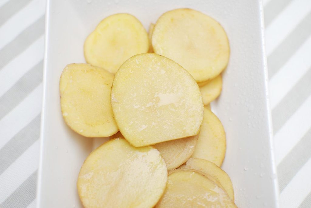 Przygotuj blachę z papierem do pieczenia. Rozłóż na nim starty ser cheddar i ułóż ładnie obok siebie ćwiartki ziemniaków, posyp je odrobiną soli i natrzyj olejem roślinnym. Piec w nagrzanym piekarniku przez 30 minut w temperaturze 200°C.