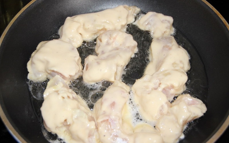 Jajka wymieszaj rózgą kuchenną z przyprawami i skrobią tak, by nie powstały żadne grudki. To ciasto zalecamy smażyć na bardzo głębokim oleju.