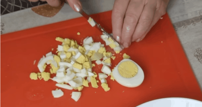 Ogórki kiszone oraz ugotowany seler pokrój w kostkę i wsyp do miski. Jajka pokrój w kostkę i dodaj do warzyw. W innej misce przygotuj sos.