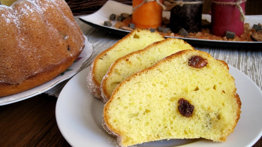 Rozgrzej piekarnik do 180°C, wysmaruj formę masłem i posyp gruboziarnistą mąką. Rozpuść masło i pozwól mu ostygnąć. W dużej misce wymieszaj mąkę, proszek do pieczenia i cukier. Wbij jajka do kubka, dodaj do miski razem z twarogiem i letnim mlekiem. Na koniec wsyp odsączone rodzynki i wlej podgrzane masło. Wyrobić gładkie ciasto i przełożyć do formy. Piecz przez 10 minut w 180°C, następnie zmniejsz temperaturę do 170-160°C i piecz przez 40-50 minut. Aby sprawdzić, czy babka jest upieczona, wbij szpikulec w najwyższy punkt – jeśli wyjdzie suchy, ciasto jest gotowe.