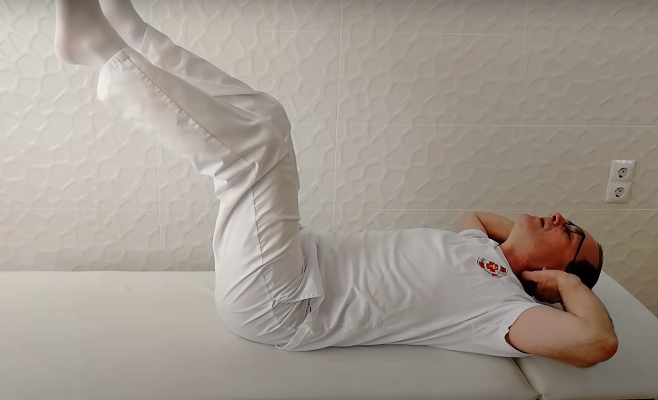 To ćwiczenie daje najlepsze rezultaty w przypadku bólów krzyża. Nogi zegnij w kolanach i – jeśli to tylko możliwe – połóż je na podwyższonym miejscu, na przykład na stołku. Ręce załóż za głowę. W czasie wydechu unieś podbródek o 5 – 10 cm, nie zginając jednocześnie szyi.