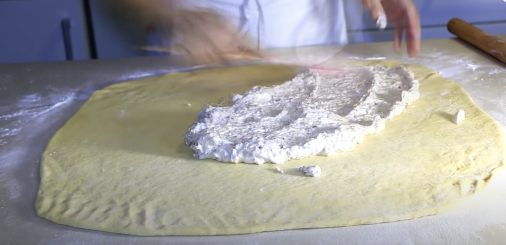 Zamierzamy spełnić: Rozwałkuj ciasto, posmaruj je nadzieniem i zawiń. Zawsze zwijamy część ciasta, rozdzielamy i dalej tak samo – otrzymujemy trzy takie bułki.