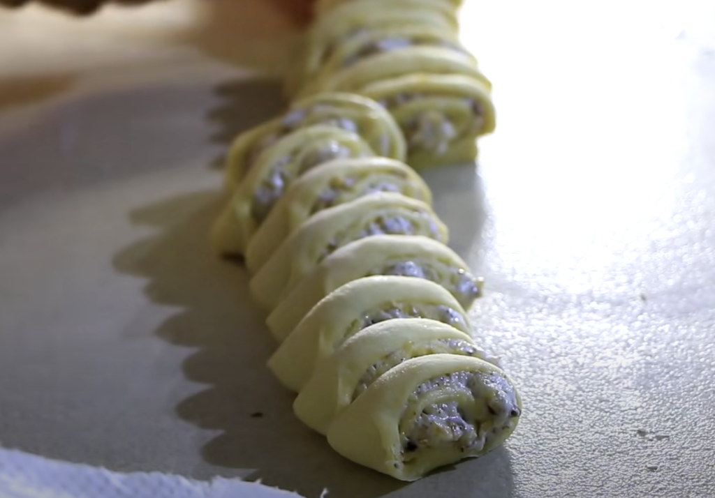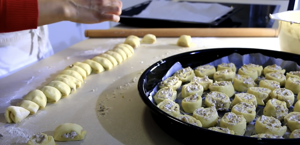Każdą bułkę pokroić w ślimaki i ułożyć na blasze do pieczenia.