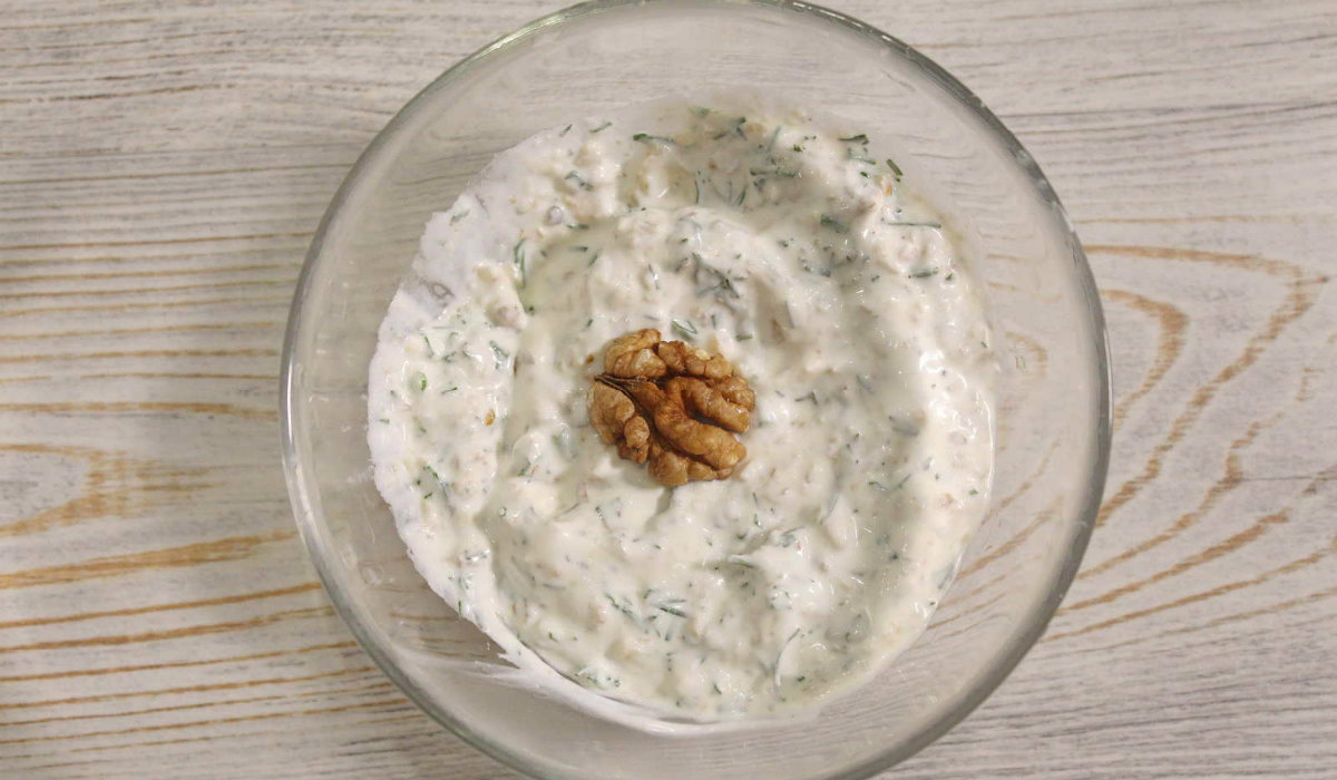 Weź 100 g miękkiego twarogu, dodaj 2 łyżki śmietany, 2-3 ząbki czosnku, pęczek ziół, garść orzechów (orzechów włoskich lub prażonych orzeszków ziemnych) i sól do smaku. Za pomocą miksera zmień wszystko w jednorodną mieszankę i ostudź. Ten sos nadaje się do wszystkich rodzajów ziemniaków.