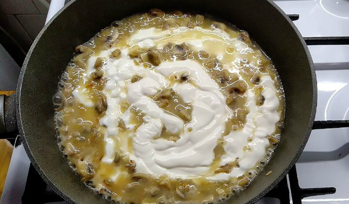 Drobno posiekaj 100 g pieczarek i 1 cebulę, podsmaż je średnim ogniu z dodatkiem masła, aż uzyskasz złoty kolor. Wlej 3-4 łyżki wody i 1-2 łyżki sosu sojowego. Cały czas mieszaj grzyby. Zmniejsz ogień do minimum. Po 5 minutach dodaj 100 g kwaśnej śmietany i dalej podgrzewaj, ciągle mieszając. Uważaj, żeby nie zagotować sosu. Posól do smaku.