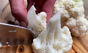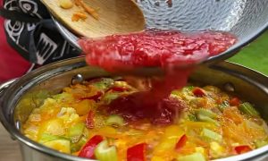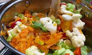 Po tym kroku, należy dodać do garnka pokrojone w paski czerwoną i żółtą paprykę, smażyć razem z pozostałymi warzywami. Gdy warzywa zmiękną, dołącz pokrojony seler naciowy i różyczki kalafiora. Następnie zalej całość litrem wody, dodaj sól, wymieszaj i gotuj pod przykryciem.