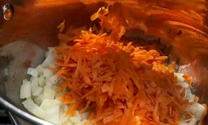 Następnie do cebuli dodaje się marchewkę startą na grubych oczkach i smaży, aż warzywa zmiękną.
