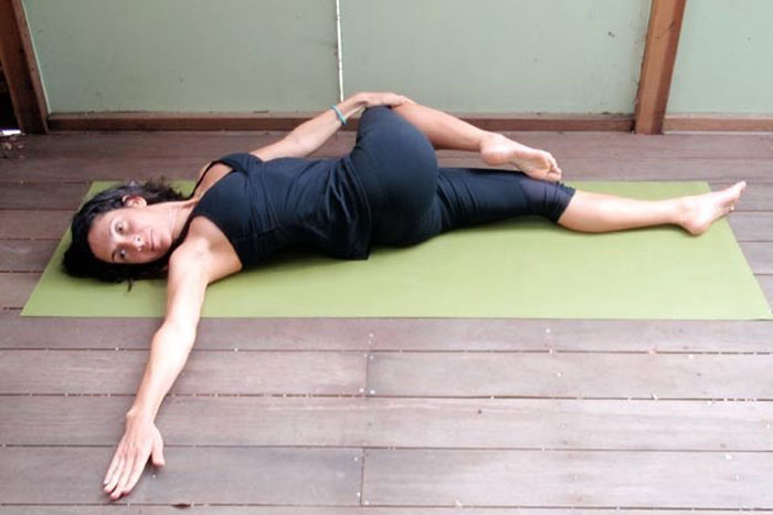 Leżąc na plecach, rozłóż ręce na boki w kształt litery „T”. Ramiona trzymaj płasko położone, a następnie ugnij nogi w kolanach i złączone przenieś na bok, aż do dotknięcia jednym z kolan podłogi. Zostań w tej pozycji przez około 60 sekund. Po tym czasie zmień stronę, przenosząc kolana i utrzymaj tę pozycję kolejną minutę.