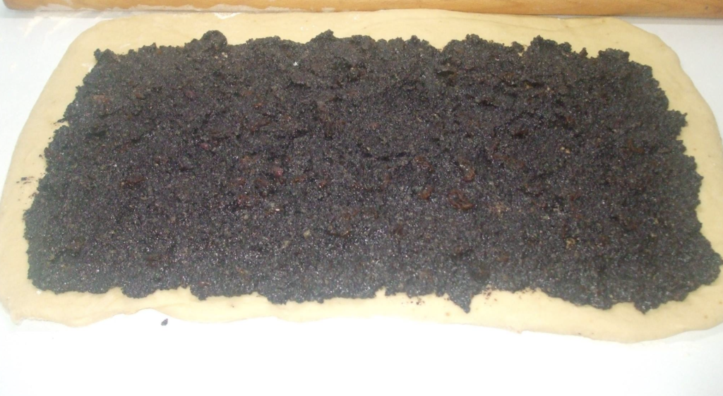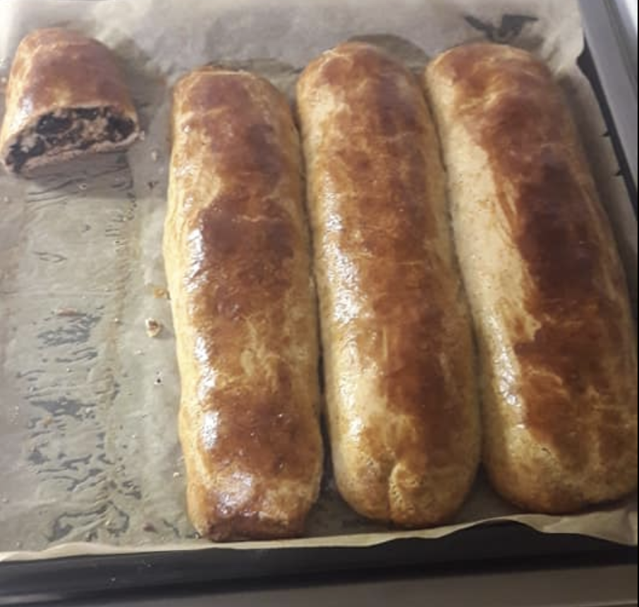 Następnie wróć do ciasta. Po posmarowaniu każdego kawałka olejem, rozprowadź masę makową na cieście, a następnie jabłka. Ostrożnie rozwałkuj ciasto i połóż je na blasze wyłożonej papierem do pieczenia. Posmaruj strudel żółtkiem, aby ładnie się zrumienił podczas pieczenia.