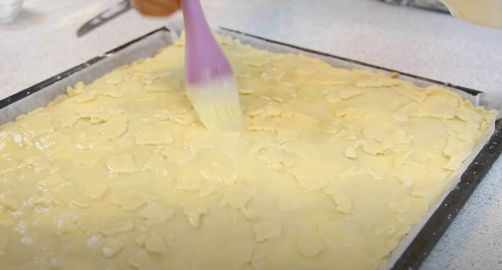 Ciasto nakłuwamy delikatnie widelcem i smarujemy roztrzepanym jajkiem.