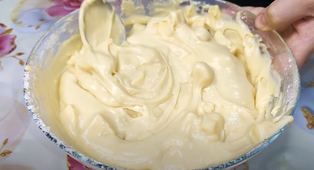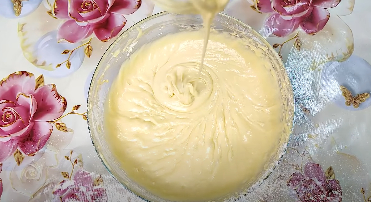 Następnie do ubitej masy dokładamy roztopione masło, mleko i proszek do pieczenia. Mieszamy na jednolite ciasto.