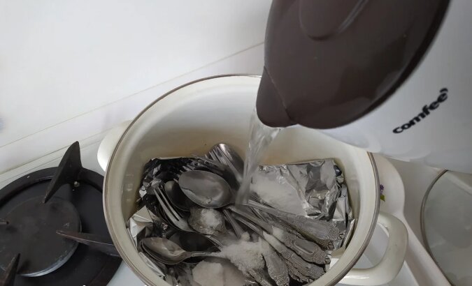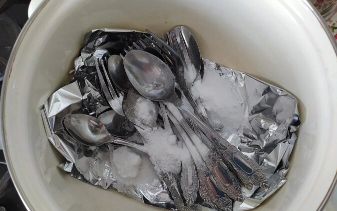 Aby przywrócić sztućcom blask jak z wystawy sklepowej, potrzebne będą proste składniki, które z pewnością każdy ma w swojej kuchni. Są to: 1 łyżka soli (najlepiej niejodowanej) z górką, 1 łyżka sody również z górką, nie więcej niż 1,5 litra wrzącej wody oraz folia.