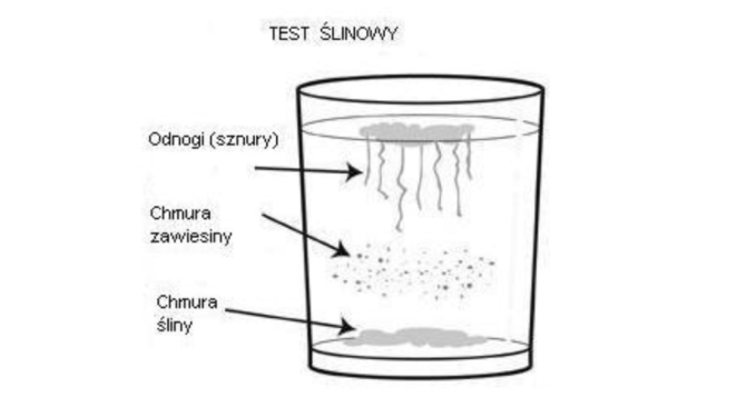 Powinno się zrobić go od razu po wstaniu, a na pewno przed umyciem zębów. Da to największą wiarygodność. Sięgnij po szklankę z wodą i napluj do niej (zbierz w tym celu trochę więcej śliny). Szklanka koniecznie musi być przezroczysta, bo w przeciwnym wypadku nie zaobserwujesz tego, co ważne, a to utrudni diagnozę.