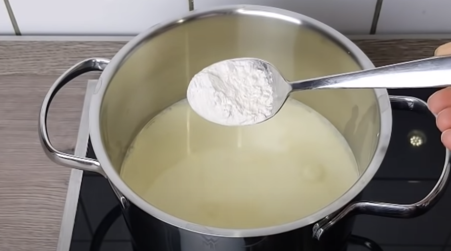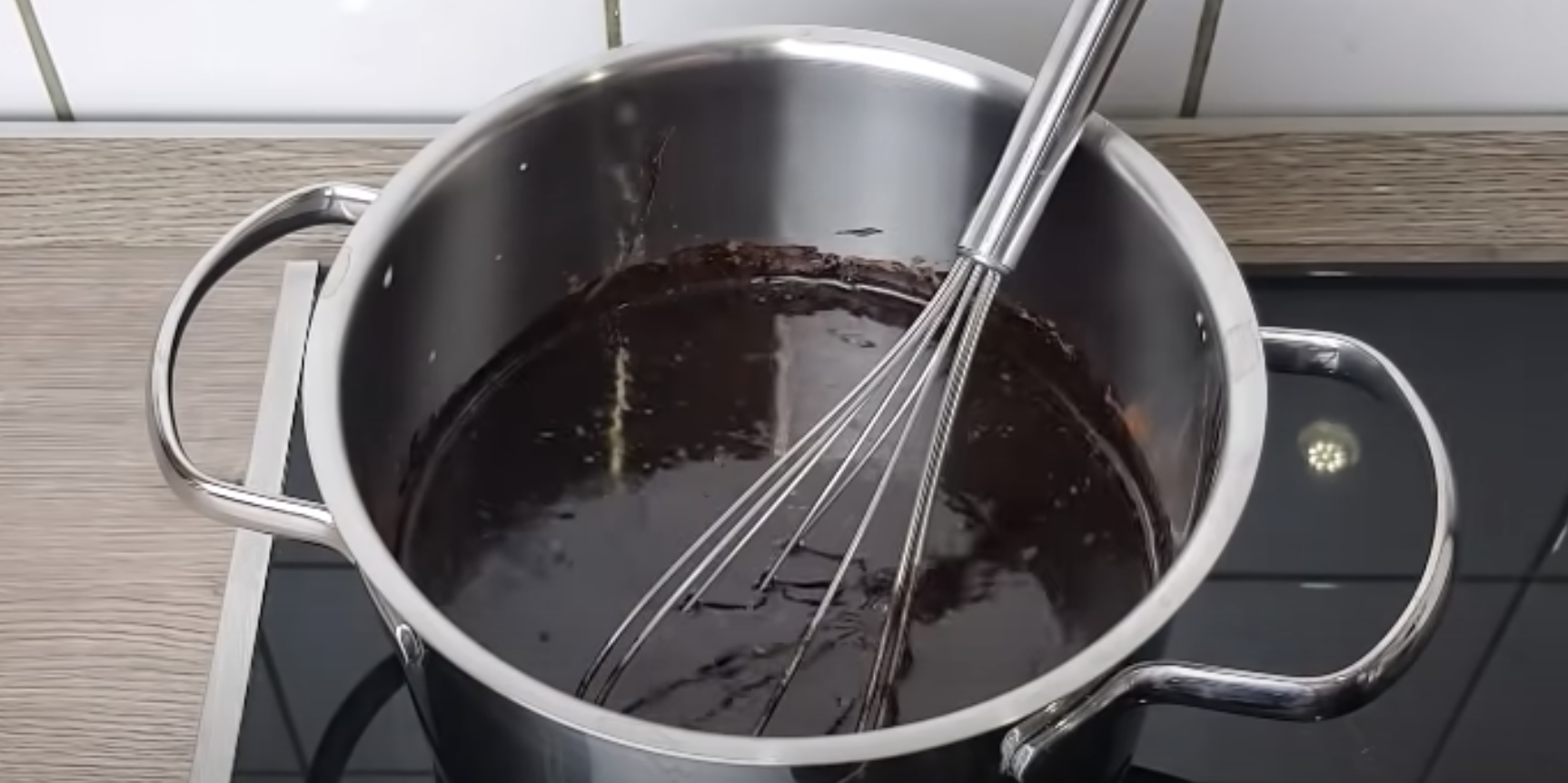 Przygotowaną mieszaninę zagotuj, dodaj pokruszoną czekoladę i ciągle mieszając, gotuj przez kolejne 2 minuty.