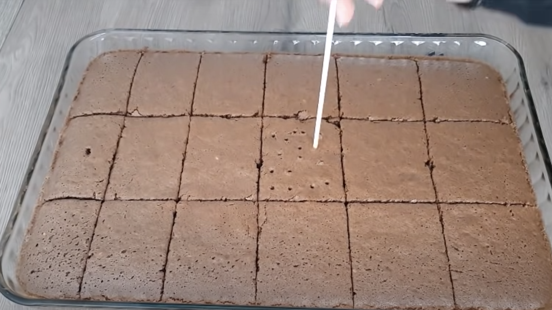 Upieczone ciasto nakłuj za pomocą wykałaczki, pokrój w kostkę i pozostaw do ostygnięcia. Następnie udekoruj deser polewą i poczekaj aż zastygnie.