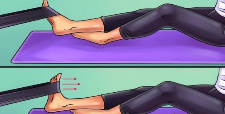 Bardzo dobre ćwiczenie na wzmocnienie wewnętrznej strony ud oraz mięśni łydek. Przygotuj kawałek elastycznego materiału i załóż go na coś wytrzymałego i stabilnego (np. jakiś mebel). Usiądź na macie, ugnij w kolanie jedną nogę i włóż ją pod drugą (wyprostowaną). Stopę wyprostowanej nogi włóż pod materiał i staraj się ją ciągnąć w swoją stronę. Wykonaj to ćwiczenie 10-15 razy na każdą z nóg.