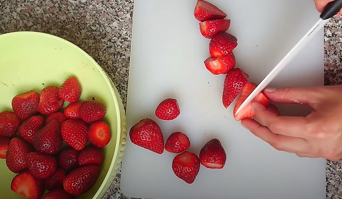 Dokładnie umyj truskawki. Pokrój każdą na pół.