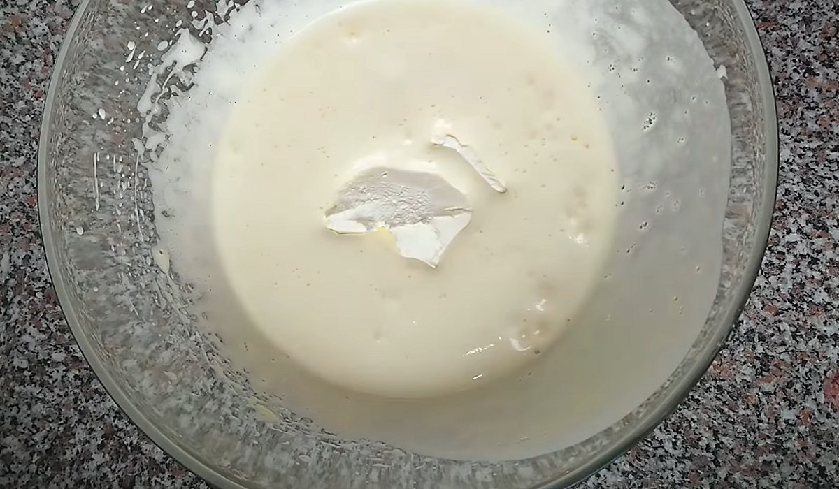 Ubijaj trzy jajka i cukier w głębokiej misce przez około 5 minut. Następnie dodaj śmietanę i olej słonecznikowy oraz wanilinę.