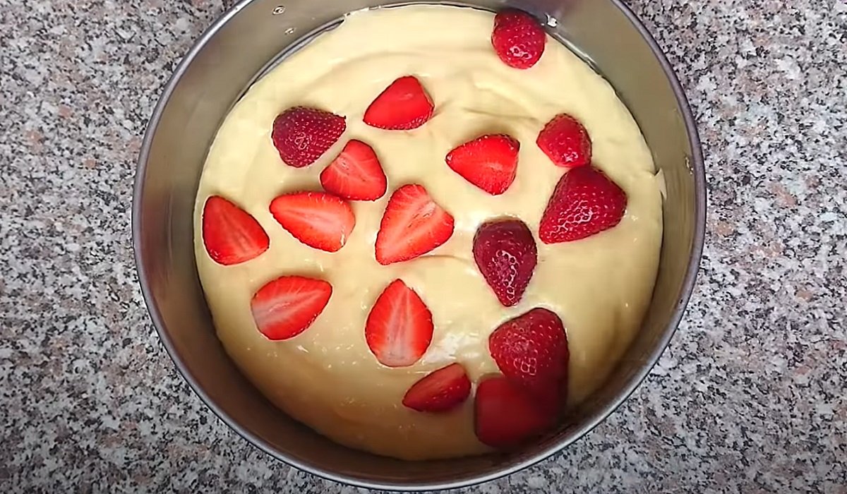 Wlej pozostałe ciasto, ułóż resztę truskawek na wierzchu i piecz ciasto w piekarniku w temperaturze 170 stopni przez 45 minut.