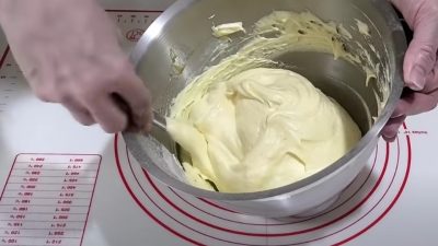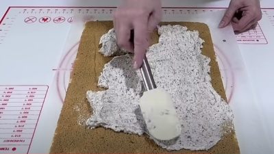 Zetrzyj dowolną czekoladę i włóż do lodówki. Cukier puder utrzeć ze śmietanką kremówką. Następnie do masy stopniowo wbijamy mascarpone (można go też zastąpić serkiem śmietankowym np. Philadelphia). Odłóż jedną trzecią śmietanki i dodaj startą czekoladę do reszty. Ciało posmarować kremem i wszystko zawinąć w papier do pieczenia.