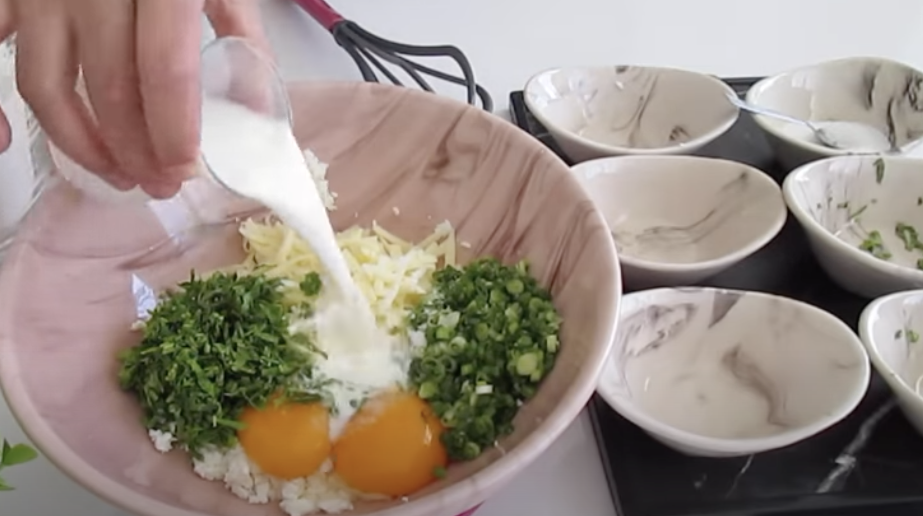 Krok 2: Do rozkruszonego sera dodaj starty twardy ser, jajka, mleko, posiekane zioła, mąkę i proszek do pieczenia. Całość porządnie wymieszaj i wyrób jednolitą masę ciasta. Następnie podziel je pół.